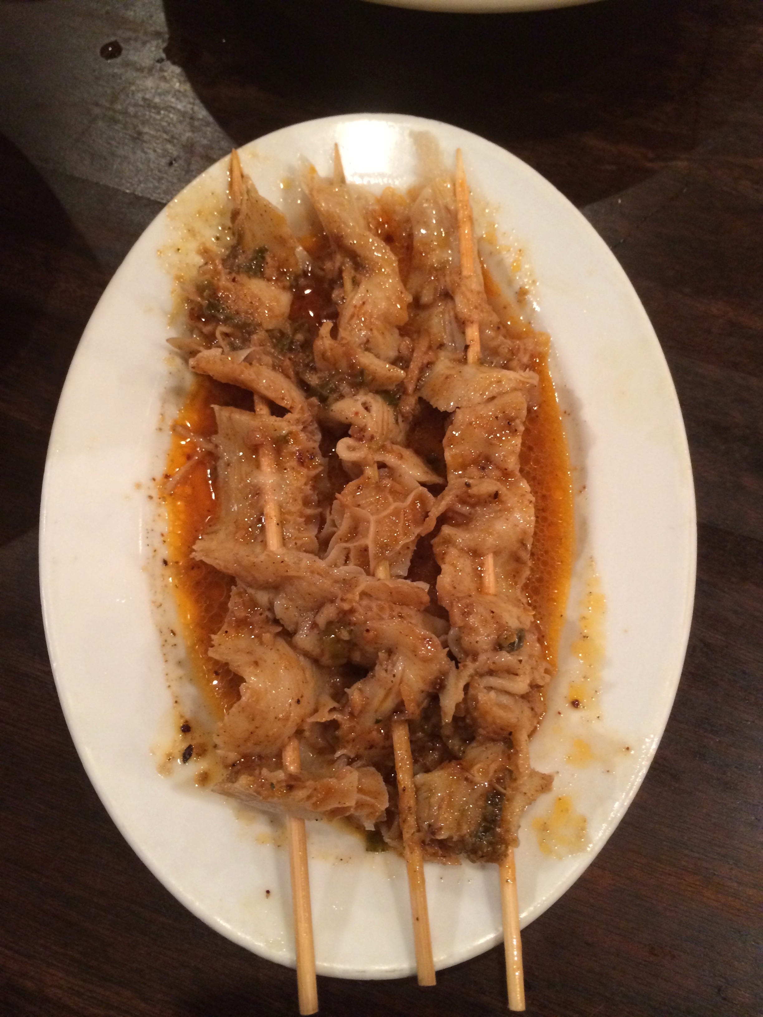 It looked like such a nice place, with exposed brick walls, hardwood floors, and Edison bulbs hanging from the ceilings. I had no idea what was about to happen. Joe quickly ordered the spicy tingly lamb face salad (good), cold skin noodles (DELICIOUS and, contrary to the name, didn’t have any skin in them at all), beef stomach skewers, and the pièce de résistance: pork intestine skewers (read: Pig Anus. Not kidding) .
